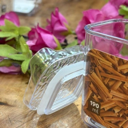 درب قفلی محکم این محصول از ورود هوا و رطوبت جلوگیری می‌کند و باعث می‌شود ادویه‌ها و مواد غذایی مثل حبوبات، خشکبار، شکر، چای و قهوه برای مدت طولانی تازه بمانند.