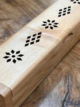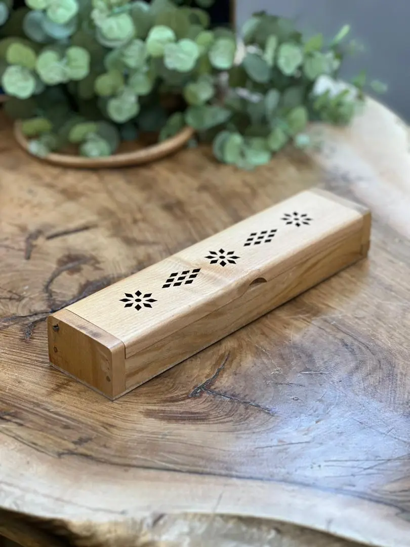 تصویر جاعودی چوبی مدل تابوت با طراحی مینیمال و نقشهای هندسی زیبا روی درب آن. مناسب برای پخش عطر عود و تزئین منزل.