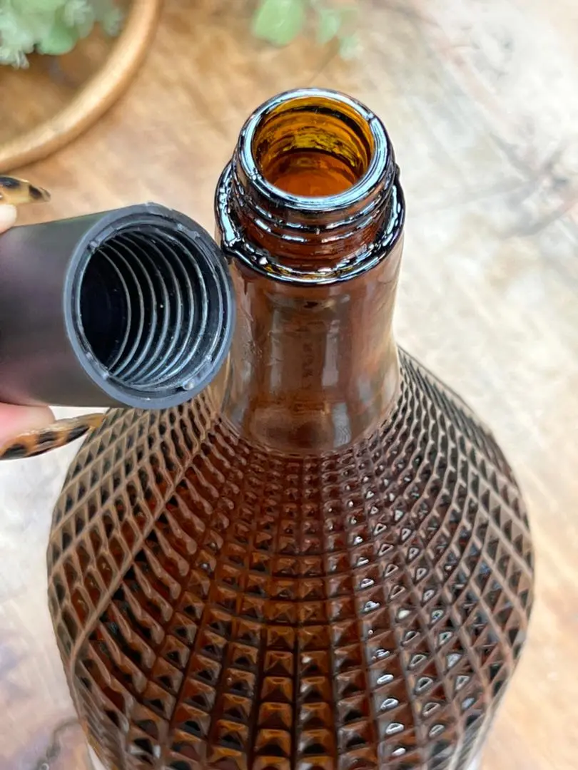 بدنه این بطری از شیشه ضخیم و مقاوم ساخته شده و دارای طرح برجسته الماسی است که علاوه بر زیبایی، از لغزش در هنگام استفاده جلوگیری میکند. رنگ قهوهای تیره آن باعث میشود مایعات در برابر نور مستقیم محافظت شده و کیفیتشان حفظ شود. درب پلاستیکی پیچی نیز نشت مایعات را به طور کامل جلوگیری میکند.