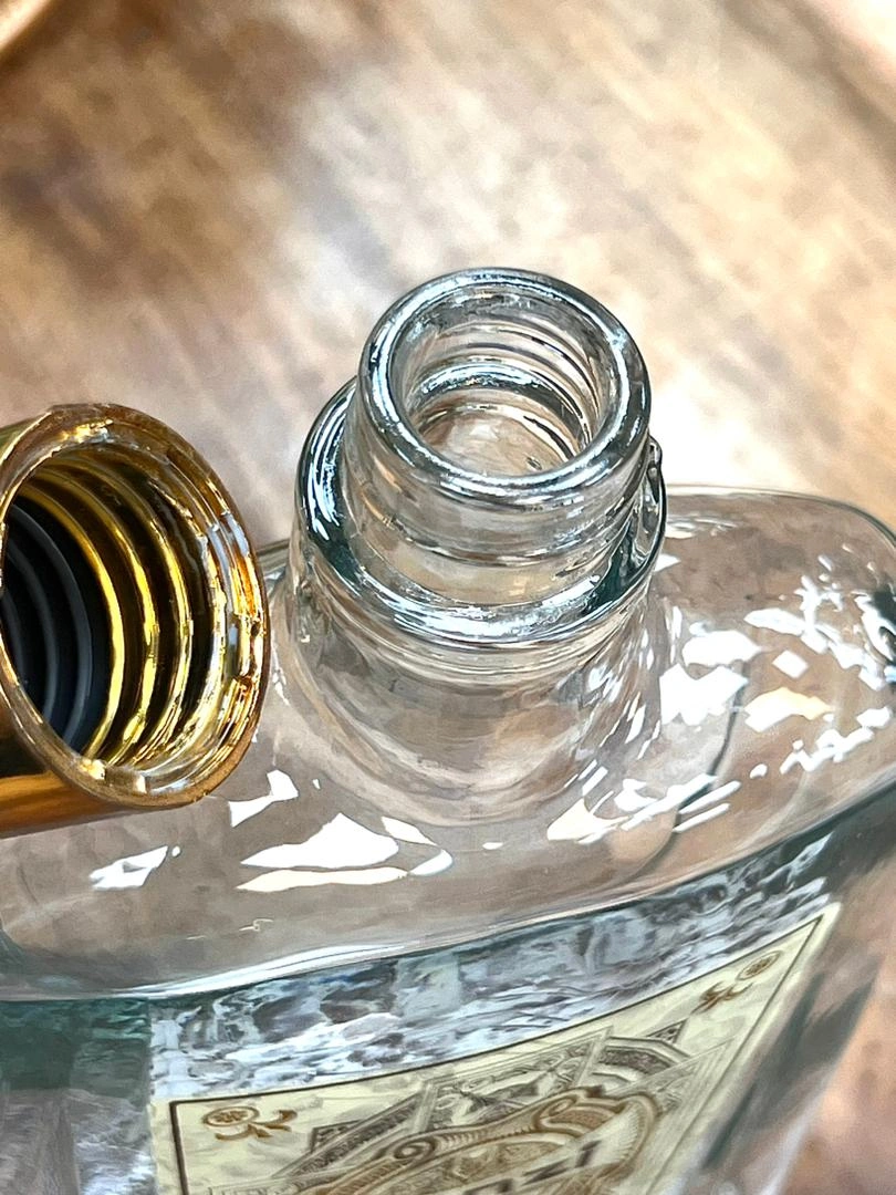 درب فلزی طلاییرنگ، حس مدرن و اشرافی به بطری داده و در عین حال از ورود هوا و آلودگی به مایع داخل جلوگیری میکند. طراحی مربعی شکل بدنه با گوشههای نرم، باعث میشود هم زیبا به نظر برسد و هم بهراحتی در دست گرفته شود.