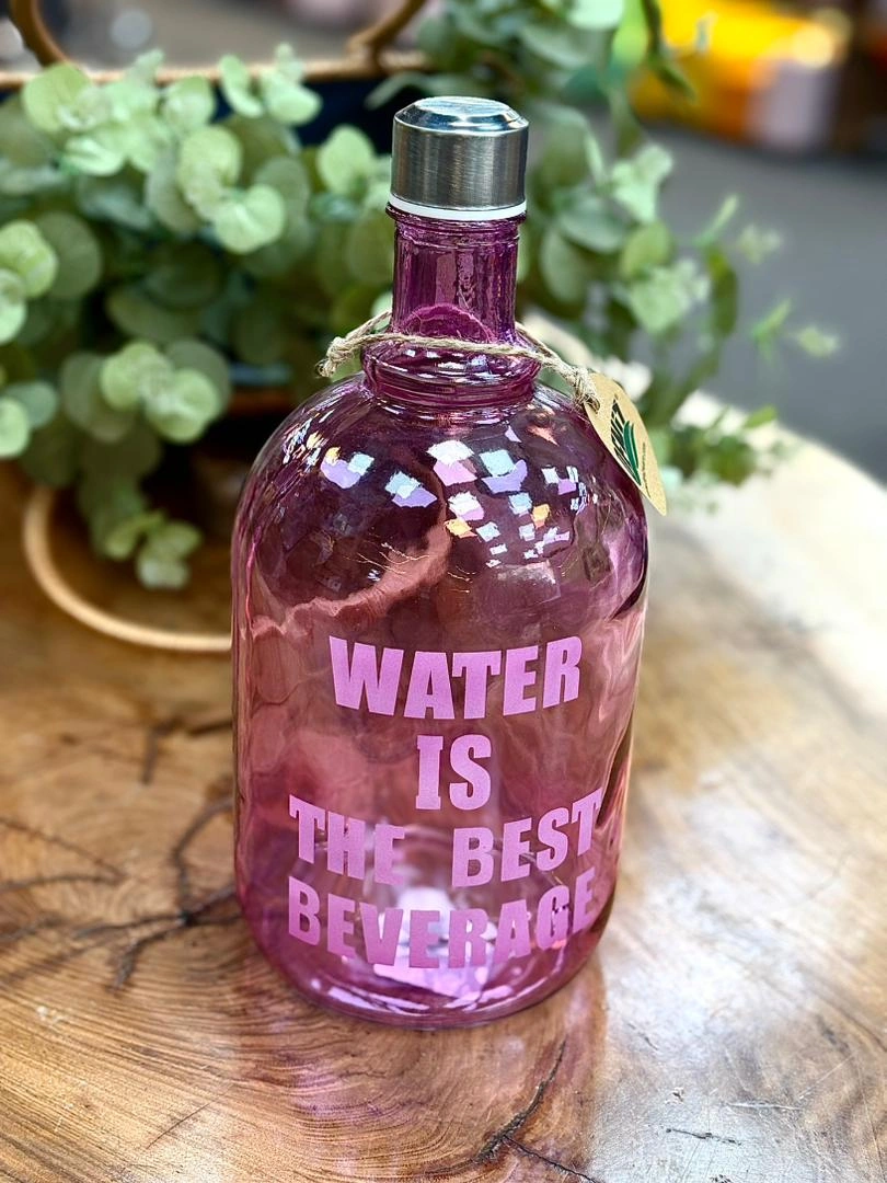 بطری شیشهای آیکال رنگی از برند معتبر Deniz با رنگ خاص و طراحی مدرن، یکی از زیباترین بطریهای شیشهای موجود در بازار است. این مدل با رنگ شفاف بنفش (آمتیتیست) و نوشتهی “WATER IS THE BEST BEVERAGE” روی بدنه، حالوهوای خاصی به فضای آشپزخانه یا میز نوشیدنی میدهد.