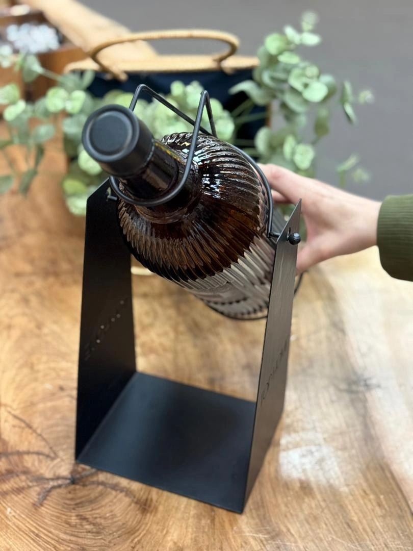 این مدل دارای استند فلزی محکم است که هم به زیبایی بطری افزوده و هم استفاده از آن را راحتتر کرده است؛ بهویژه هنگام ریختن مایعات یا سرو نوشیدنیها. درب بطری از جنس پلاستیک باکیفیت بوده و بهصورت پیچی بسته میشود تا از نشت مایعات جلوگیری کند.