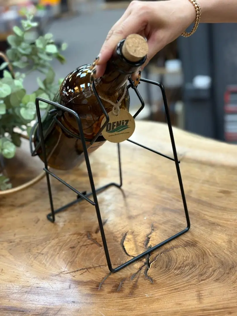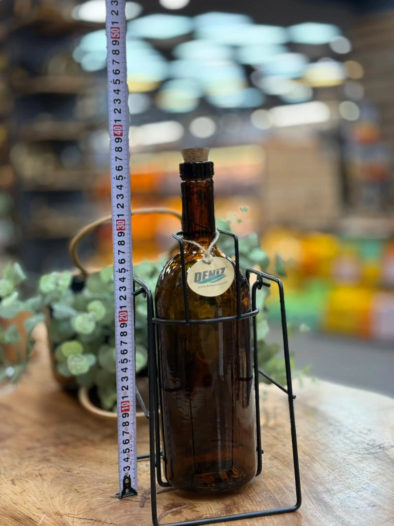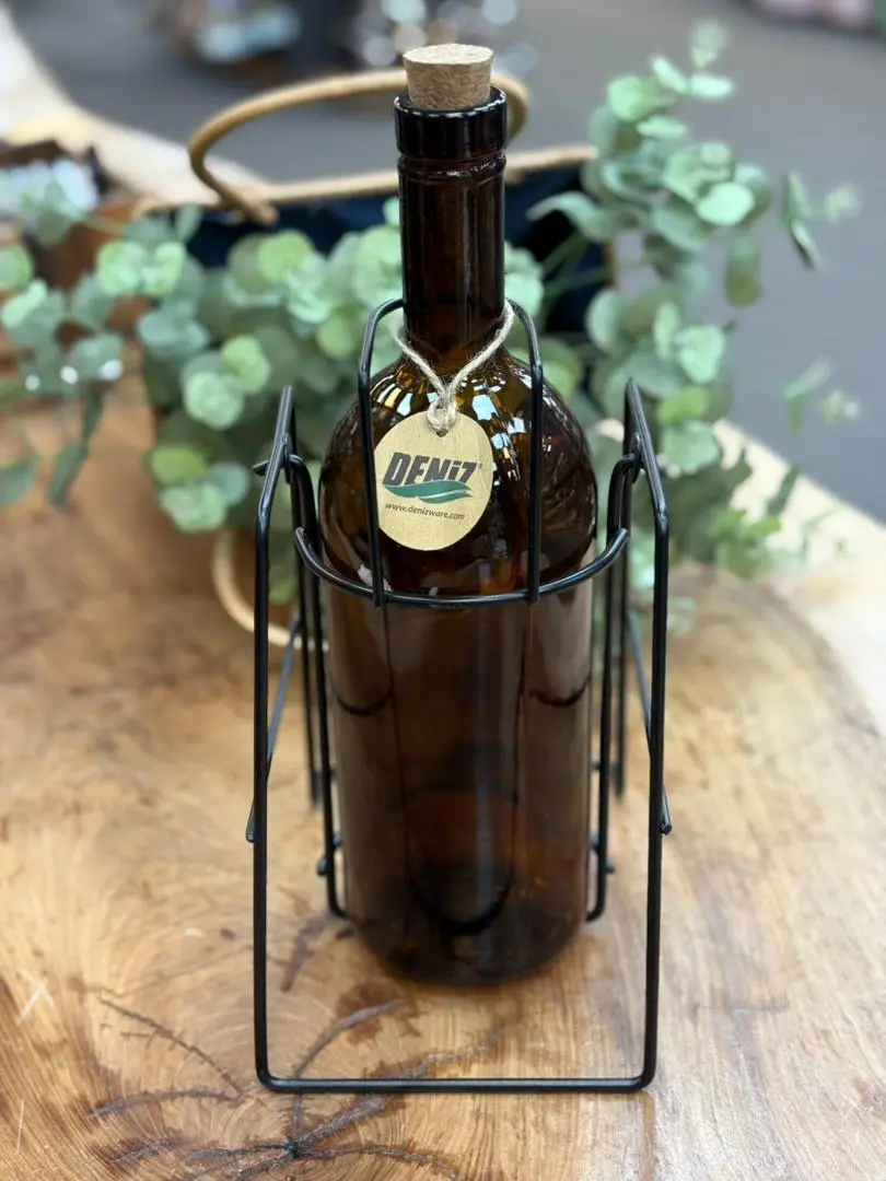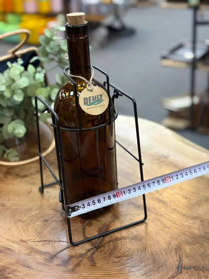 Deniz Brown Glass Bottle with Wooden Cork and Metal Stand