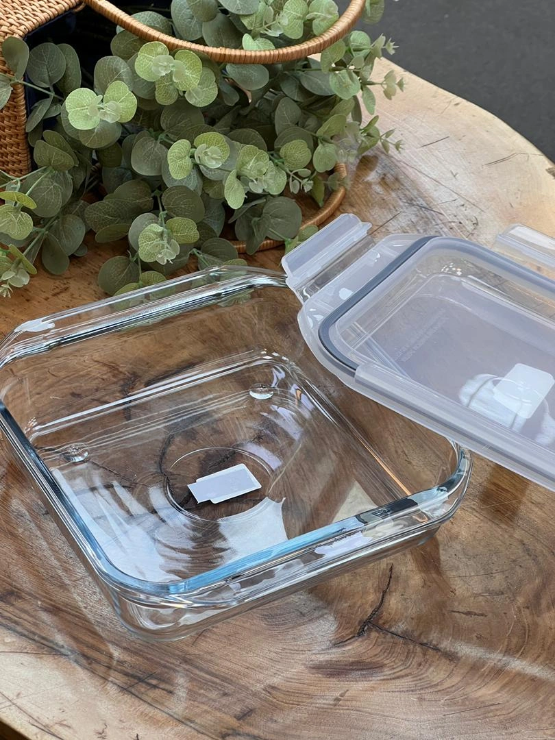 ظرف شیشه‌ای مربعی با درب چفت‌شونده، مناسب برای نگهداری انواع مواد غذایی. مقاوم، زیبا و به‌صرفه – محصولی از سبد.